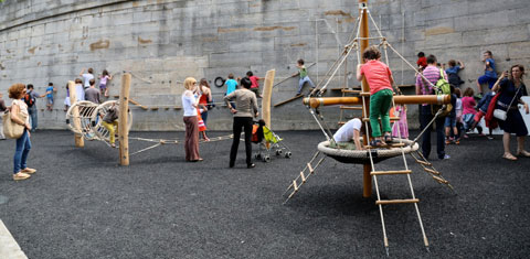 – des espaces de repos (chaises longues entre autres), des bancs formés de poutres au sol un peu comme des mikados ou des kaplas géants,