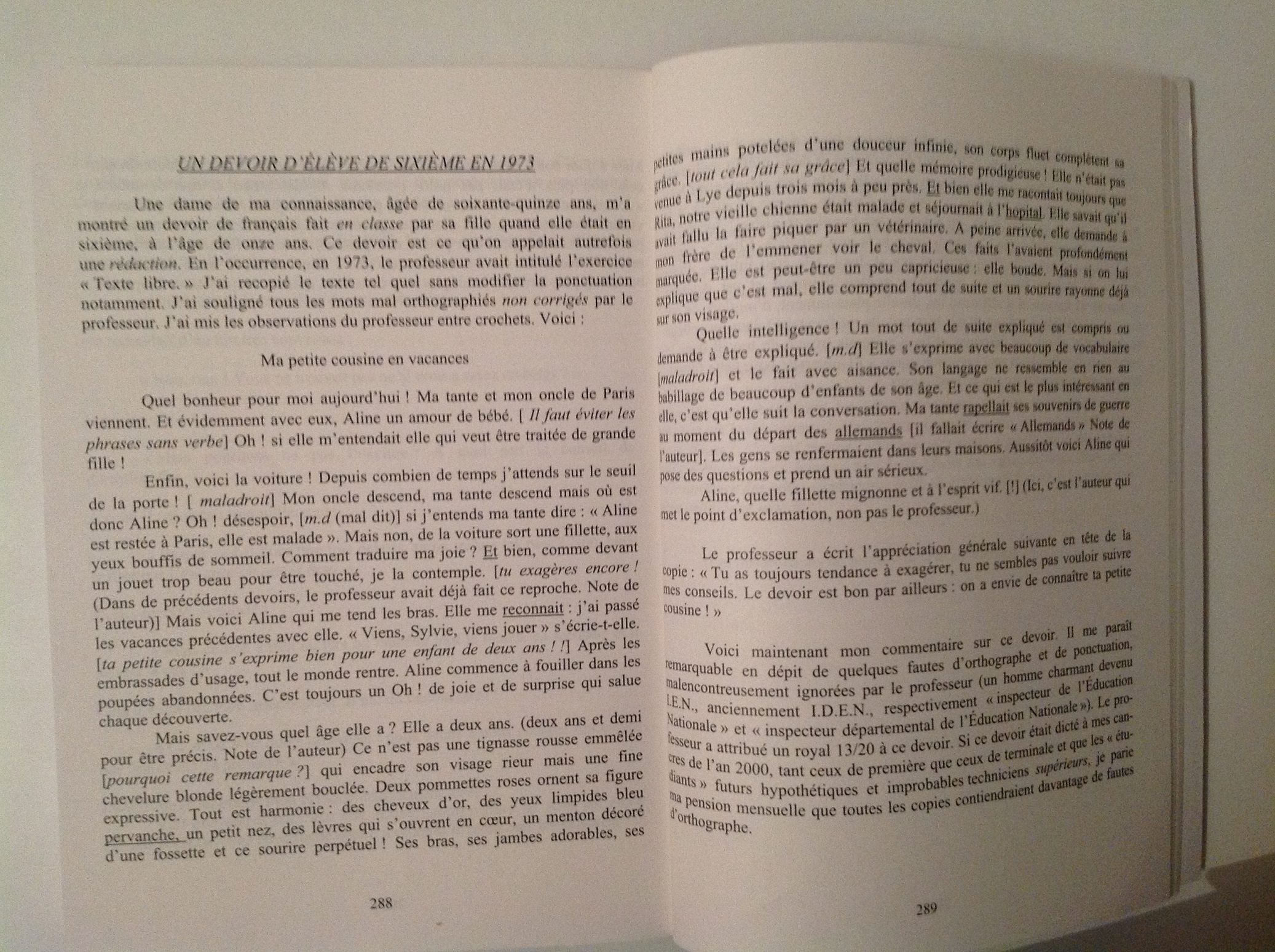 A la fin de son livre, il publie une rédaction écrite en classe pour une jeune fille de 11 ans en 6ème. La voici. Lorsque je compare à ce que mes enfants (et sans doute les vôtres…) écrivent, cela fait mal. (cliquez deux fois sur la photo pour la voir en grand)